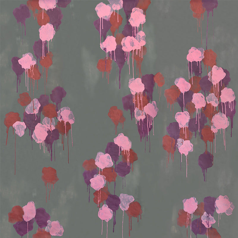 FLORAL GRAFFITI is a large-scale hand-painted abstract floral pattern made up of layers of ink applied at various levels of evaporation. The process creates a field of abstract "flowers" that appear to be dripping down the mottled field. The result is a multi-dimensional landscape that at first appears compositionally simple, but reveals a lush bouquet of texture and transparency upon further inspection.